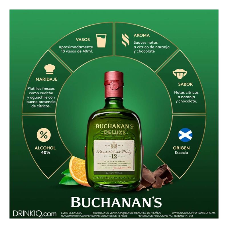 ChedrauiBuchanan's Deluxe 12. Un whisky con un añejamiento de 12 años de perfil suave y refrescante, que a la vista presenta un color ámbar con notas aromáticas de cítrico de naranja, se percibe toques de chocolate al gusto y al olfato, perfecto para acompañar, con platillos frescos de ceviche y aguachile con buena presencia de cítricos. Buchanan´s cree que si tienes algo increíble lo debes compartir. Somos un whisky que vino a revolucionar a todos los que buscan inspirar a otros a través de la pasión, la convicción y acción, manteniéndonos orgullosos de nuestras raíces y cultura. Existimos para celebrar la verdadera grandeza en todas las personas.