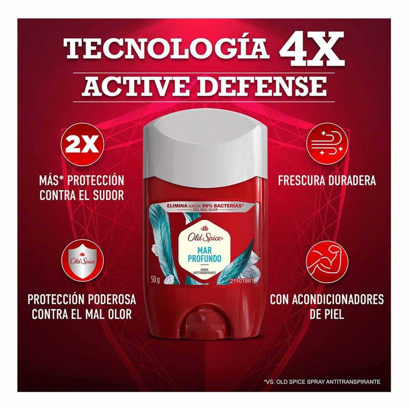 ChedrauiSu fórmula elimina hasta el 99% de las bacterias* que causan el mal olor, protegiendo tus axilas del mal olor durante todo el día. Además, gracias a su tecnología 4X Active Defense+, forma una capa antitranspirante de alta duración que te ofrece: 2x más protección contra el sudor**, Protección poderosa contra el mal olor, Frescura duradera, Con acondicionadores de piel, *Basado en pruebas realizadas con bacterias que causan mal olor corporal: STAPHYLOCOCCUS EPIDERMIDIS, S. HOMINIS & CORYNEBACTERIA MUCIFACIENS, C. TUBERCULOSTEARICUM. ** Vs Old Spice spray antitranspirante