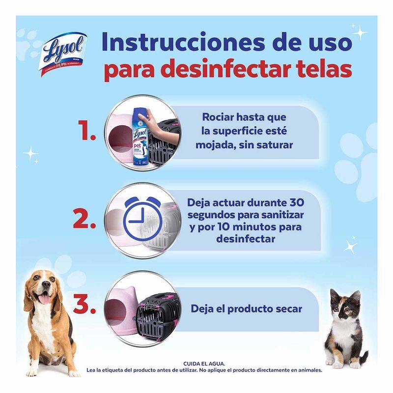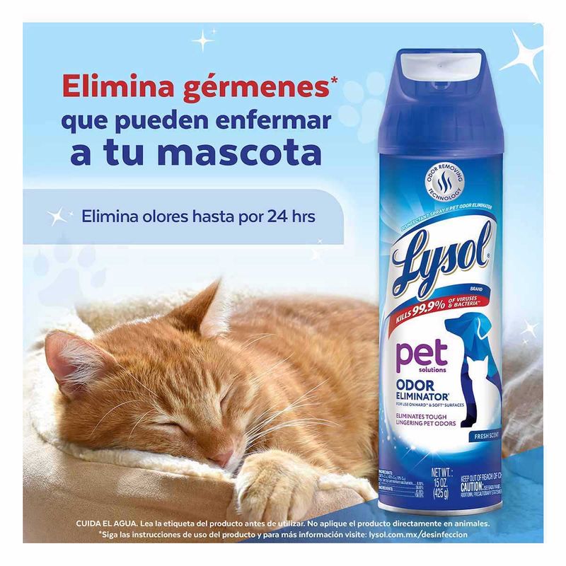 ChedrauiLysol Pet Solutions es un spray desinfectante y eliminador de olores de mascotas que: Elimina los olores difíciles de mascotas sobre tejidos y superficies duras - no porosas Elimina olores y deja una fragancia ligera y fresca Elimina 99.9% de virus y bacterias* Use el producto en: Camas para mascotas, transportadora para mascotas, sofás, muebles tapizados, alfombras. Lea atentamente la etiqueta antes de usar el producto.